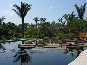 Estanque con Victoria regia en "Burle Marx Plaza" del jardín de Brasil en el Jardín botánico de Naples.