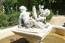 Presenta un diseño similar al jardín del Rey pero con elementos de menor tamaño; planta cruciforme, cuyos ejes principales se encuentran en el centro dando lugar a una plaza cuadrada, y fuente central de piedra de Colmenar. A esos ejes se añaden otros dos transversales para crear ocho cuadros de plantación,[3] los cuales se acompañan de rosales y remates en bola en las esquinas.[4] La fuente es de planta mixtilínea y posee un grupo escultórico de una pareja de amorcillos sujetando un pez.[5]