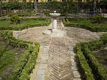 Consta de tres áreas bien diferencidas. El cuerpo central, el más importante, está dividido en cuatro cuadrantes, entre los cuales se abren varios caminos, realizados con ladrillos aparejados a sardinel. En la intersección de los mismos, aparece situada una fuente de reducidas dimensiones, labrada en granito. Está formada por una columna y una taza, que presentan relieves en espiral, a modo de columna salomónica.