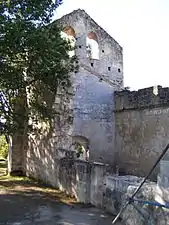 El castillo se apoya a la capilla y tiene aproximadamente el mismo tamaño que ésta.