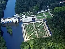 El château de Chenonceau tenía dos jardines separados, el primero creado en 1551 para Diana de Poitiers, favorita del rey Enrique II, con un gran parterre y un chorro de agua, y el segundo, más pequeño, creado para Catalina de Médicis en 1560 sobre una terraza construida sobre el río Cher, dividida en compartimentos, con una estanque en el centro.[1]: 14