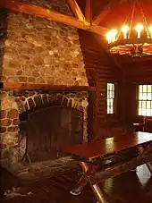 - Log Cabin (Cabaña de troncos) - Esta cabaña de troncos fue construida en 1936 por la Works Progress Administration (WPA). Hoy en día se utiliza activamente para recepciones y otros eventos en los jardines. La cabaña de madera se encuentra ubicada con vistas al Westons Mill Pond, una sección del Lawrence Brook.