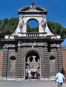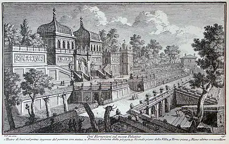 Alejandro Farnesio (1520-1589) fue nombrado cardenal-diácono de la Iglesia Católica en 1534 (a la edad de 14 años) por Pablo III, su abuelo, que había sido elegido papa dos meses antes. Se le recuerda por ser un anticuario que reunió la mayor colección de escultura romana reunida en manos privadas desde la antigüedad, la famosa Colección Farnesio.[1] En 1550, cuando Farnesio adquirió una parcela en el norte de la colina del Palatino (históricamente la más antigua de las siete colinas de Roma), hizo rellenar las ruinas de una Palacio romano de Tiberio en el extremo noroeste de la cima de la colina, y las convirtió en una casa de veraneo donde hizo plantar el jardín en estilo formal italiano. El lugar está soportado por una serie de estructuras porticadas construidas bajo los emperadores Domiciano, Trajano y Adriano, y que lo elevan sobre el Foro Romano; está cerca del Arco de Tito.