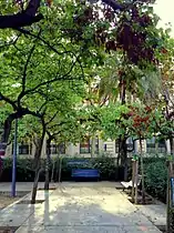 Una primera hilera de palmeras acompaña un jardín interior que dibuja la sucesión de tres espacios diferenciados por la floración de los árboles, sobre un sinuoso fondo curvilíneo.