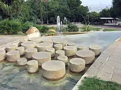 En el nivel inferior se sitúa asimismo la escultura Homenaje a Barcelona (1968), de Josep Maria Subirachs, perteneciente a la denominada etapa «de las penetraciones y las tensiones» del artista (años 1960), caracterizada por el empleo de cuñas encajadas con tornillos y tirantes de hierro, o de piezas tensadas con cables o cuerdas, en ensamblajes que jugaban con la materia y el espacio, con elementos opuestos como materia y forma, gravitación y contrapeso, vacío y lleno, horizontal y vertical.[2]