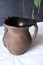 Esta vasija tradicional, en forma de jarra, se destinaba para beber vino con comodidad gracias a su particular bico (un pico vertedor de tipo estrangulado).[2] Dicho bico, a diferencia del de las jarras usadas para agua, se estrechaba en la base para que el vino saliera «de a pocos»; el vertido, como con los porrones debía hacerse despacio pues si se levantaba excesivamente la jarra caía el vino sobre el bebedor. Los curiosos relieves o cordones que salen del mencionado bico tenían la función de compactar la pieza, además de su simbolismo y valor decorativo. Algunas de estas jarras podían llevar una especie de medias bolas como si fueran ojos a los lados del bico, por encima de los bigotes.[3]