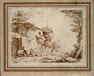 - "Paisage", aguafuerte (35 x 23) muestra un hombre leyendo y otro dibujando; aguafuerte firmado con sus iniciales y datado 1769 (?)