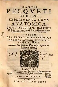 - (en latín) Experimenta nova anatomica, quibus incognitum hactenus chyli receptaculum, et ab eo per thoracem in ramos usque subclavios vasa lactea deteguntur. Ejusdem Dissertatio anatomica de circulatione sanguinis et chyli motu. Accedunt clarissimorum virorum perelegantes ad authorem epistolae, apud S. et G. Cramoisy (Parisiis), 1651, in-4° , pièces limin., 108 p., disponible sur Gallica.