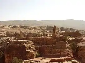 El nombre Jebel al-Madbah significa montaña del altar, y es bien merecido ya que su cumbre está cubierta por estructuras ceremoniales excavadas en roca a las que se accede por una escalera de roca. El historiador francés Maurice Sartre escribió que el pico "consiste en una gran explanada rectangular vaciada de tal manera que los lados formaron bancos; en medio de uno de los lados largos, se colocó un podio natural (motab) donde estaban los dioses. Otra sección estaba reservada para el altar. Las cisternas, alimentadas con agua de lluvia, se usaban para las abluciones y la limpieza. Más abajo, dos gigantescos obeliscos, tallados en las rocas, aparecen como piedras sagradas".[3]