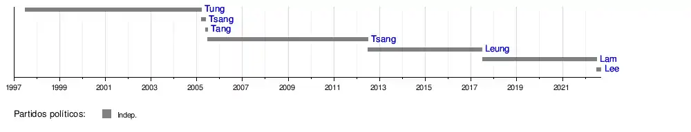 1 de julio de 1997 - 12 de marzo de 2005 | ![]() | Tung Chee-hwa | Independiente | Primer Jefe Ejecutivo luego de la transferencia a la República Popular China. |