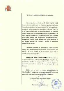 El 29 de julio de 2011 el Ministro de Justicia del Gobierno de España expidió una Declaración de reparación y reconocimiento personal, constatando la ilegitimidad y nulidad de la sentencia dictada contra Jesús Valdés Oroz.