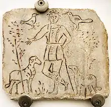 ![]() Retrato del siglo III en el techo de las catacumbas de San Calixto en Roma, representando a Jesús de Nazaret como el Buen Pastor Crióforo. | ||