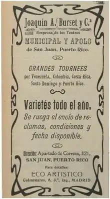 En 1907, la publicación quincenal madrileña "El Arte del Teatro" reseñó que los artistas de la compañía de zarzuela que actuaba en el teatro municipal de San Juan bajo el mexicano Gustavo Campos, y que había terminado "de un modo violento y desastroso", habían conseguido el agrado del público bajo la dirección del maestro Burset.[33] Esta misma publicación reseñó el éxito obtenido por el maestro Burset, junto al maestro Casas, en sus presentaciones en el antiguo caserón "La Republicana" de Santo Domingo. De ahí salieron en gira para San Pedro de Macorís y Santiago de los Caballeros.[34]