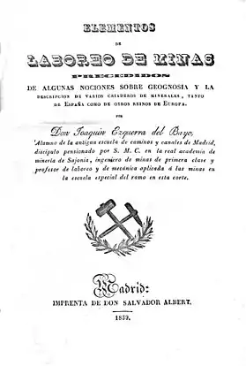 - Elementos de laboreo de minas precedidos de algunas nociones sobre geognosia y la descripción de varios criaderos minerales, tanto de España como de otros reinos de Europa. Se trata de su obra más importante, de la que se hicieron dos ediciones en Madrid, una en 1839 y otra en 1851.Se considera el primer libro moderno de tecnología minera escrito por un autor español.[6] Ambas ediciones incluyen un atlas, la primera de 13 láminas y la segunda de 16 láminas. Entre las láminas del segundo tomo se encuentra una en la que aparece el arco de unión entre la veta de San Nicolás y la de San Francisco, en la mina de Almadén, una importante obra de ingeniería minera de la época. En 1847 se llevó a cabo una edición copia de la primera, sin conocimiento ni autorización del autor, impresa en la Imprenta de Los Tribunales, Santiago de Chile. En esta edición se utilizó la ortografía chilena oficial de la época, que había sido propuesta por Juan García del Río y Andrés Bello. Las láminas se redibujaron y regrabaron de nuevo, casi idénticas a las originales[7]