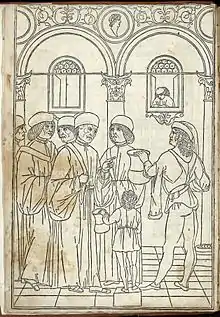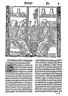 Frontispicio del libro: "Compendio de la humana salud". Pamplona: Arnao Guillén de Brocar; 10/10/1495.