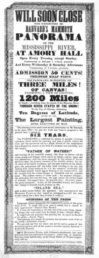 Es considerada la mayor obra del neoyorkino y la que le lanzó a la fama. La obra se presentó el lunes 29 de junio de 1846 en el Apollo Saloon de Louisville, Kentucky; con un precio de entrada de 50 centavos. Hay publicaciones en periódicos del día posterior al primer lanzamiento que comentan que el teatro estaba abarrotado y coinciden en que era un espectáculo sin precedentes en la ciudad.[4] El espectáculo se anunciaba como “la pintura de tres millas de largo”, aunque es cierto que dicho panorama medía menos de 500 metros de largo. En cuanto al contenido de la obra, la pintura detalla con delicadeza la rivera oriental del río (no obstante, a partir de los numerosos plagios que tuvo la obra, Banvard decidió pintar la parte occidental del Mississippi).[2] Desde el punto de vista del espectáculo, no trataba solo de contemplar el panorama móvil (que consistía en desenrollar el lienzo a lo largo del escenario mediante un par de manivelas que se ocultaban detrás del telón), sino que mientras este se observaba, John Banvard narraba al público presente numerosas aventuras que había vivido en su trayecto poniendo énfasis en algunos puntos del relato. Además, se jugaba con la velocidad del despliegue del panorama para fortalecer la narración del artista; todo esto se producía al mismo tiempo que la mujer tocaba diferentes piezas en el piano.[2][3]