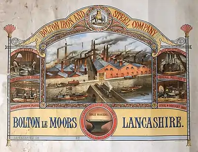 También se dispusieron equipos[69] de laminación, fundición y fragua. Inicialmente, sus productos incluían vigas y chapas de acero para las cubiertas de los barcos.[70] Durante 1865, la Bolton Iron & Steel fundió el bloque de un yunque más grande fabricado en Inglaterra, con un peso de 210 toneladas. En 1869, la empresa producía acero con hornos de hogar abierto y fabricaba martillos pilones con el diseño de Francis Webb.[69][71] El sobrino de Hick[63] se convirtió en accionista tras su incorporación a la empresa el 9 de junio de 1876.[72]