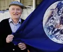 ![]() John McConnell enfrente de su casa en Denver, Colorado, Estados Unidos, con la bandera de la Tierra que él diseñó. | ||