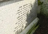 - Newton es conmemorado con su epitafio escrito por él mismo en su tumba en Olney: JOHN NEWTON. Empleado. Una vez, un infiel y libertino, un siervo de esclavos en África, fue preservado, restaurado, perdonado y designado para predicar la fe por la rica misericordia de nuestro SEÑOR y SALVADOR JESUCRISTO por la fe que durante mucho tiempo se había esforzado por destruir. Cerca de 16 años como Curador de esta parroquia y 28 años como Rector de St. Mary Woolnoth.