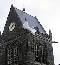 La noche antes del Día D (6 de junio de 1944), sucesivas oleadas de soldados norteamericanos de la 82.ª División Aerotransportada fueron lanzados al oeste de Sainte-Mère-Église. La ciudad había sido el blanco de un ataque aéreo y una casa al este de la plaza de la ciudad comenzaba a quemarse debido a una bomba incendiaria errante. La campana de la iglesia se comenzó a tocar para alertar a los pobladores quienes salieron de sus casas en grandes cantidades formando una brigada supervisada por miembros de la guarnición alemana. Para las 01:00 horas, la ciudad ya estaba bien iluminada y llena de soldados alemanes y pobladores cuando de pronto, dos grupos de paracaidistas del 1.er y 2.º batallón aterrizaron (por error) directamente sobre la ciudad.