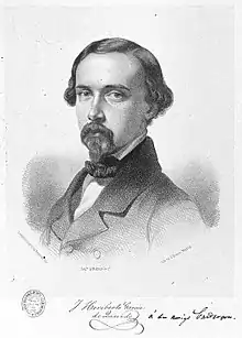 ![]() Retrato de José Heriberto García de Quevedo, litografía de Leopoldo López de Gonzalo por pintura de Federico de Madrazo, Madrid, Litografía de J. Donon. Facsímil del autógrafo «J. Heriberto García / de Quevedo». Biblioteca Nacional de España. | ||