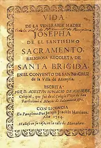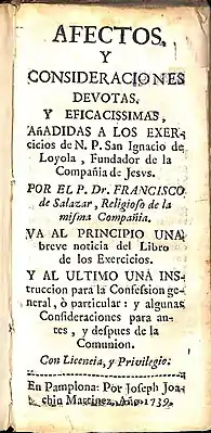 Vende grandes cantidades de libros piadosos que se distribuyen con ocasión de las misiones que los jesuitas predican por toda España y, de manera especial, las que protagoniza el jesuita de Tafalla Pedro de Calatayud. Así, en 1734 envía al librero de la ciudad de Murcia Juan Royo Pérez,[15] por importe de 14.000 reales, 8.082 ejemplares de obras piadosas[16] tales como los Ejercicios de san Ignacio, Combate espiritual, “doctrinas”, Vida cristiana, Retiro espiritual, Visita de enfermos, Dios solo. Estas publicaciones se venderían masivamente en la misión que en ese mismo año el afamado Pedro de Calatayud predicó en Pamplona.