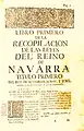 El solemne grabado calcográfico con las armas de Navarra que aparece en el primer tomo se encargó a Juan de la Cruz, un platero aragonés afincado en Pamplona.[13] Este había planteado dos leones flanqueando el escudo pero la Diputación le ordenó sustituirlos por cornucopias, como alegoría de la prosperidad. La impresión del frontispicio, que se realizaba en tirada aparte, en el tórculo, también correspondió a José Joaquín Martínez, que cobró seis maravedís por cada grabado; claro está que por encima del precio de impresión de los dos volúmenes. Por este concepto el grabador cobró 600 reales y el impresor 170.[14]