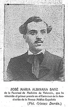 José María Albiñana Sanz (Enguera, 13 de octubre de 1883-Madrid, 23 de agosto de 1936) fue un médico, escritor y político español, conocido como el doctor Albiñana, líder y fundador del Partido Nacionalista Español.[2] Murió asesinado por milicianos del bando republicano en las primeras semanas de la guerra civil española en la conocida como Matanza de la cárcel Modelo de Madrid.