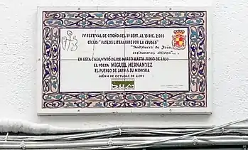 Placa conmemorativa de la estancia de Miguel Hernández en Jaén, marzo-junio de 1937.