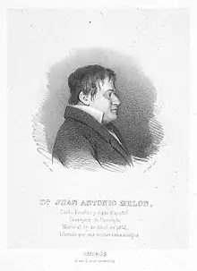![]() Juan Antonio Melón. Litografía firmada «Goya del. Gilliang Lith.» Inscripción: «D.n JUAN ANTONIO MELON, / Docto, Erudito y digno Español / Consejero de Hacienda / Murió el 17 de abril de 1843 / Llorado por sus numerosos amigos / AMORÓS / á su buena memoria». Biblioteca Nacional de España. | ||