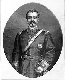 ![]() «D. Juan Contreras y Martínez, jefe del regimiento de Lanceros del Rey (promovido a brigadier por el mérito que contrajo al frente de 98 jinetes en la batalla de Nanclares)». La Ilustración Española y Americana, 22 de julio de 1875. Dibujo de Félix Badillo. | ||