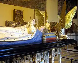 La tumba de Juan Sin Miedo está copiada de la de su padre. Se trata, por tanto, de una figura yacente sobre una losa negra, con una procesión de dolientes de alabastro debajo (monaguillos, clérigos, familiares, oficiales y personal doméstico envueltos en mantos de luto) bajo arcadas formadas por dobles tramos alternados y hornacinas triangulares. Juan Sin Miedo comparte su tumba con su esposa, Margarita de Baviera. Dos ángeles sostienen el yelmo del duque, dos ángeles escuderos están a la cabeza de su esposa mientras que dos leones yacen a sus pies. La calidad es comparable a la de Felipe el Temerario, muchas de las plañideras son incluso copias exactas de las plañideras de la tumba de Felipe, pero más tarde, durante el montaje de las tumbas, los dolientes se han mezclado, lo que dificulta cualquier comparación estilística. Trasladada a Saint-Bénigne en 1792, la tumba se encuentra hoy, como la de |Felipe el Atrevido, presentada en el Museo de Bellas Artes de Dijon. En 2012-2013, sus plañideras fueron cedidas a prestigiosos museos donde se presentaron de forma independiente, como el Museo de Cluny de París.