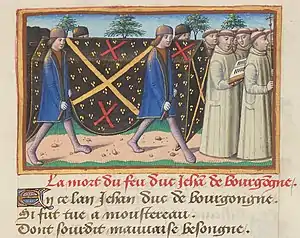 Como su padre Felipe el Atrevido, Juan Sin Miedo fue enterrado en la Cartuja de Champmol. Felipe el Bueno, hijo y heredero de Juan Sin Miedo, se compromete a hacer ejecutar para él una tumba monumental, digna de su rango de príncipe, sobre el modelo de la de Felipe el Atrevido. El encargo fue dado a Claus de Werve, entonces escultor oficial de los duques de Borgoña, que había completado la tumba de Felipe el Bueno. El sitio se prolongó y, a la muerte de Claus de Werve en 1439, pasó a manos de su sucesor Jean de la Huerta. Fue completado por un tercer escultor, Antoine Le Moiturier.