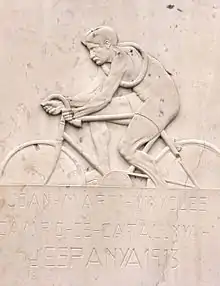 Juan Martí reposa en el cementerio de la Doma bajo un relieve escultórico que representa el campeón carrasqueño en 1913 cuando ganó la Vuelta Ciclista a Cataluña, imagen que fue extraída de una fotografía publicada en la revista Stadium .