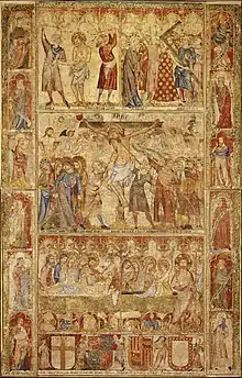 El mural, pintado al temple y pasado a lienzo, conservado actualmente en el Museo de Navarra,[5] aparece dividido en tres cuerpos horizontales y banco a la manera de un retablo. En él se representan escenas de la pasión, muerte y resurrección de Cristo —Flagelación y Jesús con la cruz a cuestas en el cuerpo superior, la Crucifixión, con Longinos, Estefatón, las Marías con san Juan y ángeles recogiendo la sangre vertida por Cristo en el central, y el Santo Entierro con la Resurrección en el inferior— con cinco juglares y los escudos del obispo Arnaldo de Barbazán, las casas de Évreux y Foix-Bearne y el arcediano Miguel Sánchez de Asiáin en el banco.[6] El conjunto se completa con dos bandas laterales en las que están representados en cada una de ellas seis profetas portadores de filacterias. También sería suya una cabeza de Cristo en marco ojival localizada originalmente en la escalera de acceso al púlpito del lector del mismo lugar, pasada a lienzo y trasladada al museo a la vez que el gran mural de la Pasión.