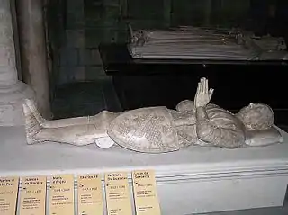 - Carlos Ramírez de Arellano (m. 1412). Fue señor de los Cameros y de otros muchos lugares,[25] y también alférez mayor del pendón de la Divisa del rey y alférez mayor del infante Fernando el de Antequera, que posteriormente llegaría a reinar en Aragón como Fernando I.[26] Y contrajo matrimonio con Constanza Sarmiento, que fue señora de Berganzo, Villaumbroso y Villatoquite y era hija del mariscal de Castilla Diego Gómez Sarmiento y de Leonor Enríquez de Castilla y bisnieta de Alfonso XI de Castilla.[27]
