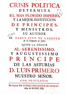 - "Crisis política: determina el más florido imperio y la mejor institución de príncipes y ministros". publicado en Madrid en 1719 por Eusebio Fernández de Huerta y dedicado al Príncipe de Asturias Luis I.