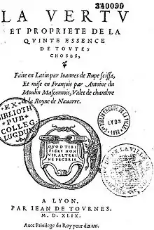 La receta de la quintaesencia según Rocatallada consta de elegir un vino que no sea ni claro ni denso, pacífico a la vista y de buen sabor. En resumen, un buen vino. Hay que destilarlo muchas veces a goteo, hasta obtener el «aguardiente» (aqua ardens).[1] Desde entonces, el método de obtención del alcohol, es decir, la destilación, se empezó a utilizar con más frecuencia. Se dice que Juan de Rocatallada fue uno de los precursores de la Iatroquímica.
