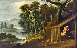 Paisaje con figuras es también un óleo con Hércules y el león de Nemea de colección particular, firmado con solo el apellido, con soluciones compositivas próximas al ermitaño de Pamplona y al Noli me tangere segoviano, disponiendo un bosque en un extremo y en el opuesto una lejanía con paisaje acuático.[12]