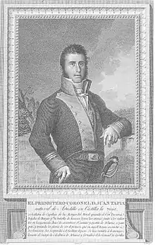 «El Presbítero Coronel D. Juan Tapia natural de Astudillo en Castilla la Vieja. Se hallaba de capellán de las monjas del Moral quando el General Besieres bajaba de Burgos para la batalla de Rioseco. Tomó las armas, juntó los valientes en Torquemada, llenó de escombros el camino y puente de Arlanza, se parapetó y teniendo la gloria de ser el primero que en aquel Reyno acometió a los franceses, les sorprendió a el facilitar el paso. Se hizo temible a el enemigo; levantó el Cuerpo de Caballería de Arlanza y Formalizó el de Granads. de Castilla». Grabado de Rafael Esteve Vilella. Biblioteca Nacional de España.