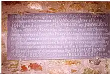 - «Este sencillo sarcófago (una vez dignificado con los restos de Juana, hija del rey Juan, y consorte de Llewelyn ap Iowerth, príncipe de Gales del Norte, que murió en el año 1237), habiendo sido traído del monasterio de Llanfaes, y ay, usado por muchos años como abrevadero de caballos, fue rescatado de semejante indignidad y colocado aquí para su preservación así como para invitar a la seria meditación sobre la naturaleza transitoria de todas las distinciones sublunares. Por Thomas James Warren Bulkeley, vizconde de Bulkeley, octubre de 1808».
