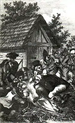 Hinter der Saw stehet ein Rabin, der hebt der Saw das rechte Bein empor, und mit seiner lincken hand zeucht er den pirtzel uber sich, bückt und kuckt mit grossem vleis der Saw unter dem pirtzel in den Thalmud hinein, als wolt er etwas scharffes und sonderlichs lesen und ersehen.Edición de Weimar (Weimarer Ausgabe) Vol. 53, pp. 600ss;
