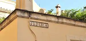 - Calle Judería. Lleva este nombre por constituir con otras calles el barrio dado a los judíos en 1264 por Alfonso X el Sabio. En él había dos sinagogas, un hospital y una alhóndiga; la última sinagoga se desplomó en 1479, día 13 de febrero. A una parte de esta calle se le ha llamado también Muladar de Carballo, y calle de la Sinagoga; es la plazoleta formada detrás de la Tornería. La otra sinagoga estaba donde hoy el Colegio del Santo Ángel, calles de Alvar López, San Cristóbal y Tornería. Es evidente que no tenía el actual perímetro del Colegio; sino sólo lo que ocupa la casa principal, calle Tornería o poco más.