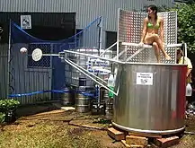 - Dunk tank (también conocido como Hombre al agua): consiste en un gran tanque de agua sobre el cual una persona se sienta en una silla colapsable. Cuando una pelota impacta un objetivo, la silla colapsa tirando a la persona al agua.[1]