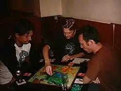 - Esta obra contiene una traducción parcial derivada de «Jeu de société» de Wikipedia en francés, publicada por sus editores bajo la Licencia de documentación libre de GNU y la Licencia Creative Commons Atribución-CompartirIgual 3.0 Unported.