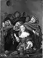 La pintura muestra de pie tras una mesa a una sonriente joven rubia elegantemente vestida a la moda que levanta el índice de su mano derecha como enfatizando algo, mientras un hombre la toma del hombro y se acerca a ella para decirle algo al oído: tiene una ristra de salchichas, judías, arenques, huevos y mejillones alrededor de su cuello, con una manita de cerdo y una cola de zorro, símbolos de glotonería y necedad respectivamente. Otro caballero divertido, con una salchicha colgando de su gorra, se apoya en el hombro del primer hombre y escucha sus palabras. Algunos reclaman que estos son los personajes del teatro barroco Peeckelhaeringh y Hans Wurst. Detrás otras personas están hablando y riendo. La jarra sobre la mesa muestra las iniciales "fh".