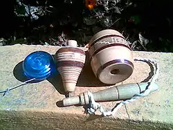 Imagen de un yo-yo, un trompo y un balero, los juguetes más típicos de malabares.