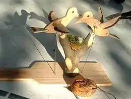 - casi exclusivamente con elementos naturales, sobre todo madera: ramas derechas (retoños, rebrotes), aquenios (cáscaras de nueces, bellotas), agallas o verduguillos, cortezas y rebuscas diversas ;