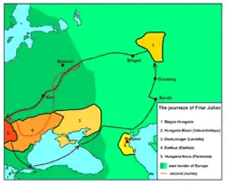 El monje Julianus emprendió un segundo viaje hacia Oriente (1237-1238) para estudiar más en profundidad a los húngaros orientales, pero cuando llegó a la Bulgaria del Volga descubrió que los búlgaros no habían podido hacer frente a los ejércitos tártaros de Batu Kan, y que habían sido conquistados y en gran parte asesinados.