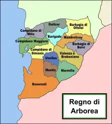 El Giudicato de Arborea fue subdividido en catorce curatorios: curatoría de la Barbagia de Austis, de la Barbagia de Belvì, de la Barbagia de Ollolai, del Barigadu, de Bonorzuli, del Campidano Maggiore, del Campidano de Milis, del Campidano de Simaxis, del Guil. de Mandrolisai, Marmilla, Montis, Usellus y Valenza.